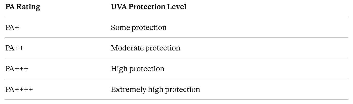 Korea — along with Japan — addressed this gap by developing and widely adopting the PA (Protection Grade of UVA) system, which rates UVA protection on a scale from PA+ to PA++++. The more plus signs, the stronger the UVA protection.